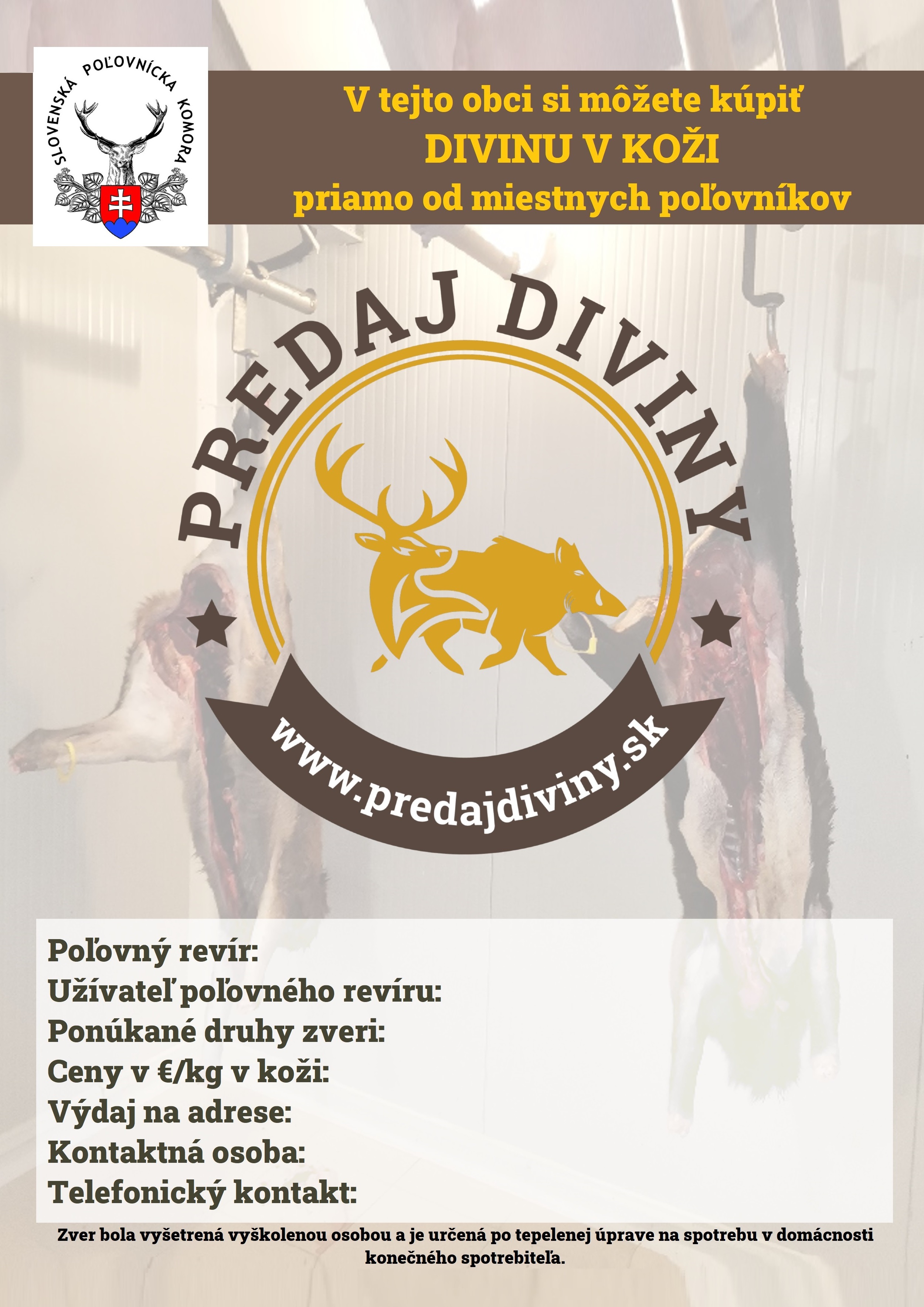 v prílohe si môžete stiahnuť plagát, ktorý si môžete vylepiť v obciach, ktoré sa nachádzajú v katastroch vášho poľovného revíru, čo Vám môže pomôcť jednak pri zvýšenom predaji, ale taktiež si po jeho vyvesení splníte podmienku podľa nariadenia vlády č. 359/2011 o predaji malých množstiev diviny.