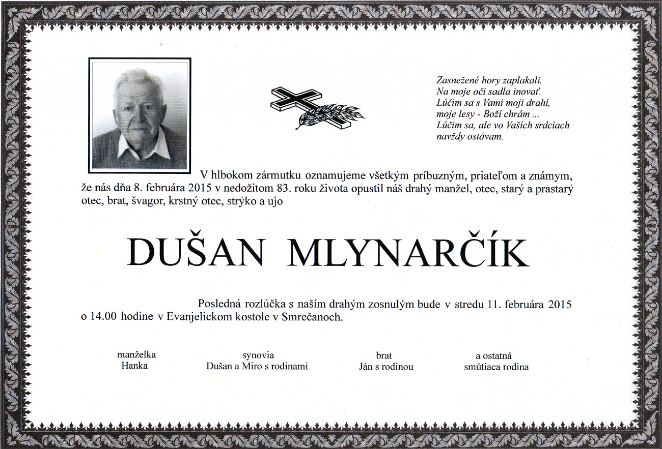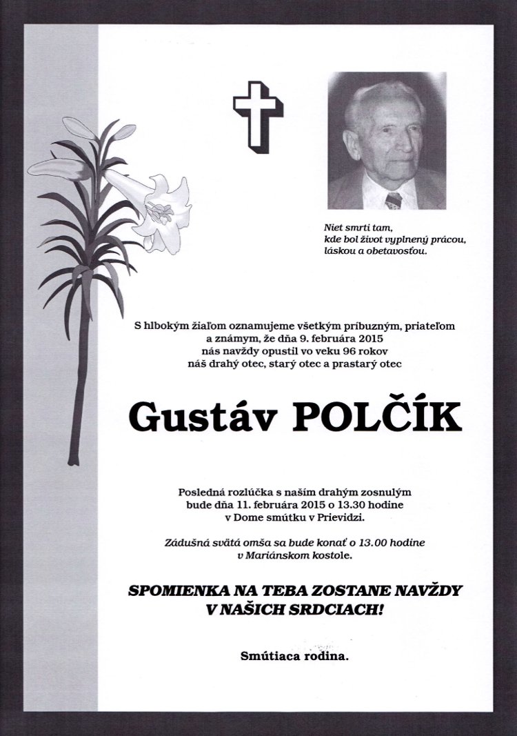 S hlbokým zármutkom v srdci oznamujeme, že dňa 09.02.2015 nás vo veku 96 rokov navždy opustil Gustáv POLČÍK. Posledná rozlúčka sa bude konať dňa 11.02.2015 o 13,30 hod. v Dome smútku v Prievidzi.