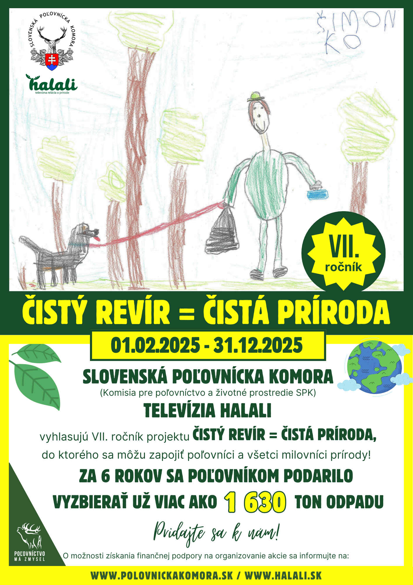 Komisia pre poľovníctvo a životné prostredie SPK spolu s tvorcami Televíziou Halali vyhlásila už po siedmykrát od 1.2.-31.12.2025 projekt Čistý revír = čistá príroda. Za 6 rokov sa nám spoločne podarilo vyzbierať už 1 630 ton odpadu!!! V minulom roku 2024 sa do výzvy zapojilo doposiaľ najviac, až 144 užívateľov poľovných revírov zo 49 (60) OPK.