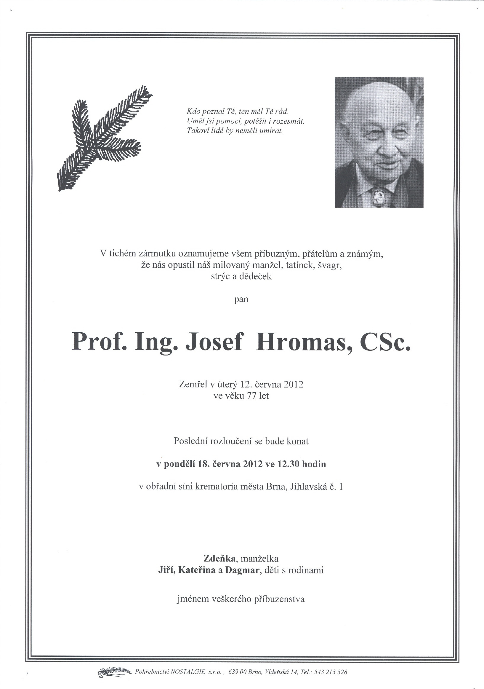 Dňa 12.6.2012 v skorých ranných hodinách zomrel nestor Českých ale aj Slovenských poľovníkov pán prof. Ing. Jozef Hromas, CSc.