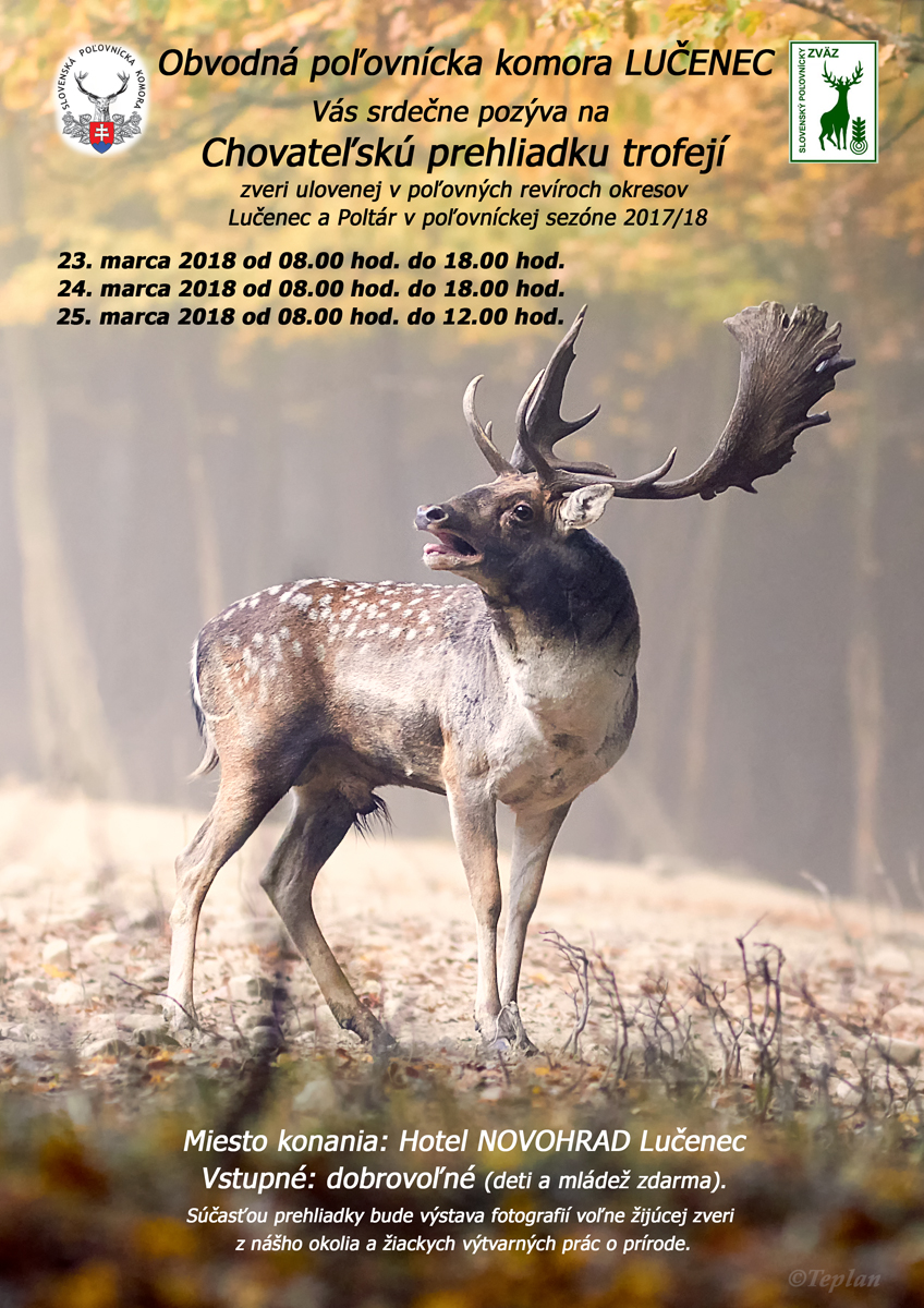 OPK Lučenec Vás pozýva na chovateľskú prehliadku trofeji zveri ulovenej v poľovných revíroch okresov Lučenec a Poltár v poľovníckej sezóne 2017/18.