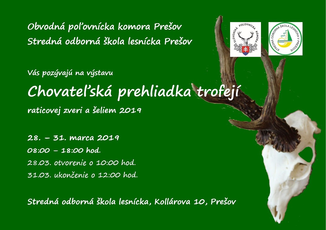 Obvodná poľovnícka komora Prešov Vás pozýva na Chovateľskú prehliadku trofejí ulovených v poľovných revíroch okresu Prešov v poľovníckej sezóne 2018/2019,