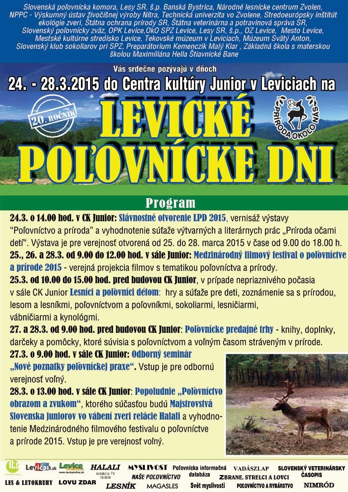 Srdečne Vás pozývame na 20. ročník Levických poľovníckych dní, ktorý sa bude konať v termíne od 24.3 do 28.3. 2015 v CK Junior v Leviciach.