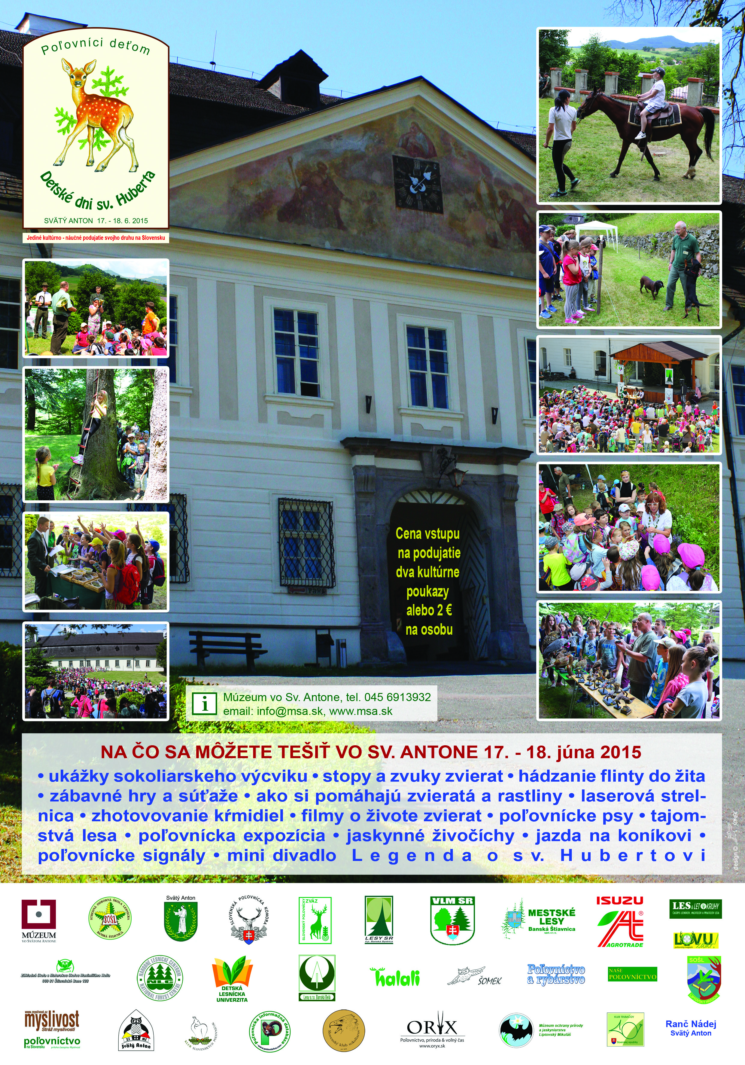 Na deti čakajú rôzne zaujímavé súťaže o pekné ceny, vystúpenie sokoliarov a trubačov, poľovnícka kynológia, poznávanie zvukov lesnej zveri a mnohé iné aktivity...