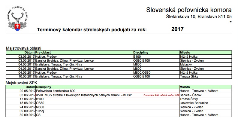 predkladáme Vám predbežný návrh termínového kalendára vrcholových streleckých podujatí v roku 2017 organizovaných Slovenskou poľovníckou komorou v spolupráci s príslušnými Obvodnými poľovníckymi komorami. Termíny ešte nie sú záväzné, preto si vyhradzujeme právo na zmenu.