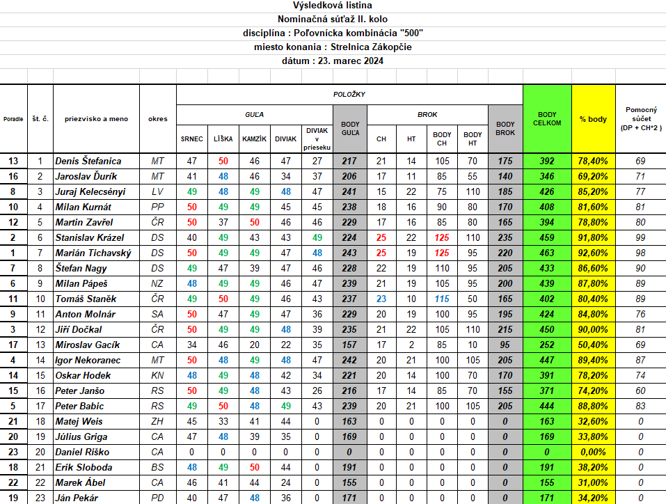 Súčtom najlepších dvoch výsledkov z troch nominačných súťaží, si miestenky do reprezentačného tímu Slovenska a Slovenskej poľovníckej komory vybojovali páni: