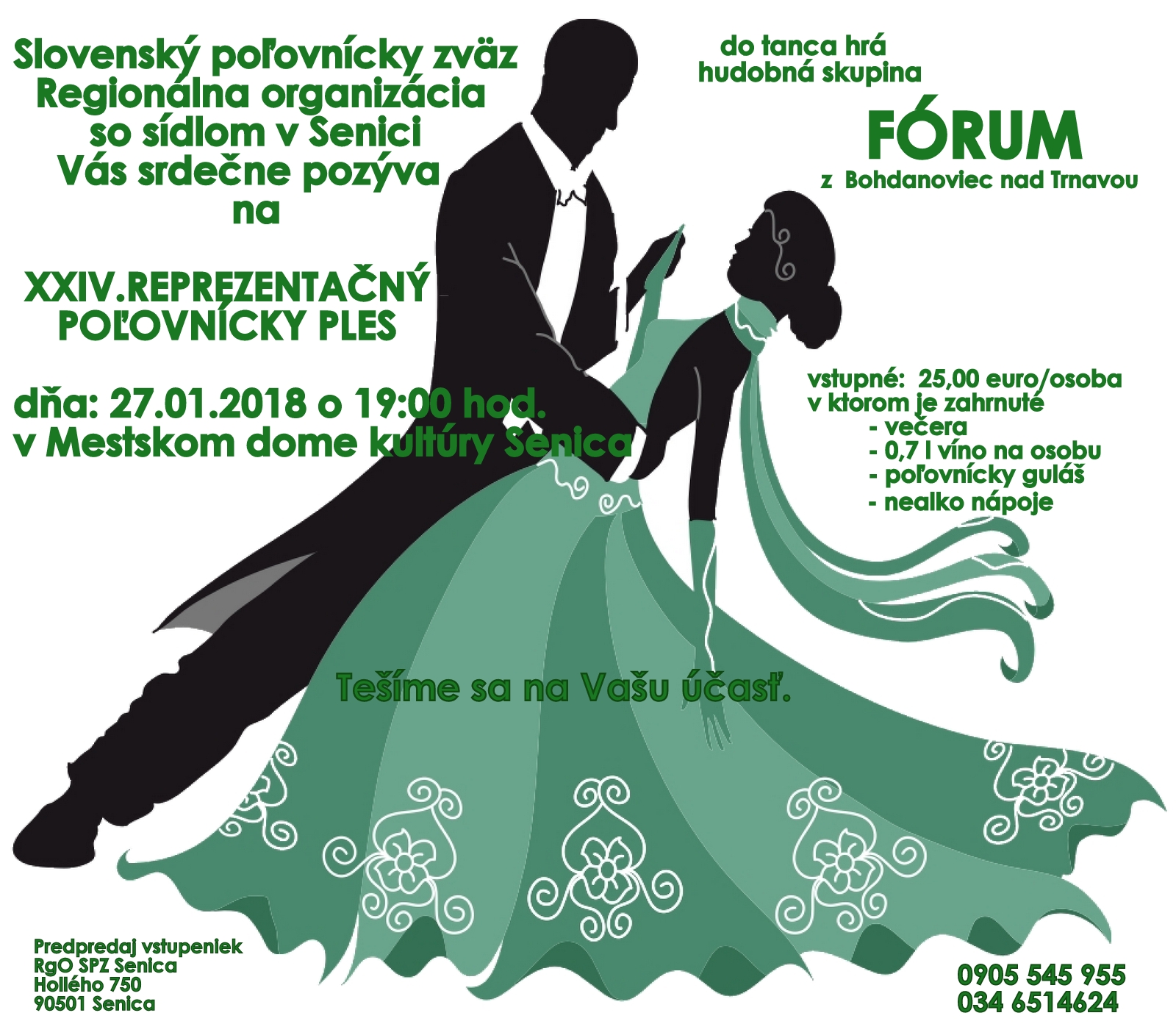 Slovenský poľovnícky zväz - Regionálna organizácia so sídlom v Senici, Vás srdečne pozýva na XXIV. Reprezentačný poľovnícky ples, dňa 27. januára 2018 od 19:00 hod., v MsDK Senica, do tanca hrá hudobná skupina FÓRUM.Cena vstupného 25,00€.