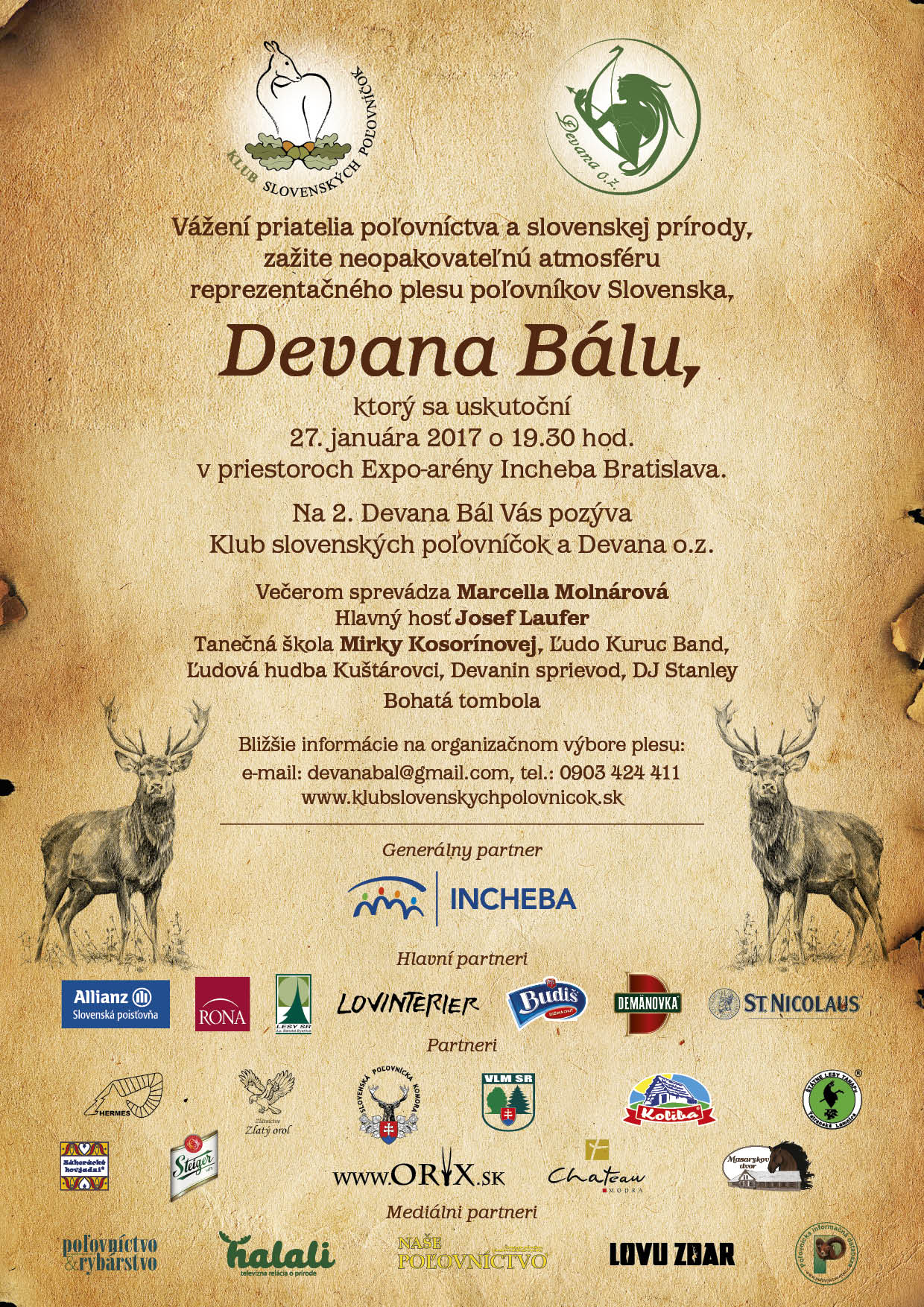 V januári tohto roku sme založili tradíciu stretávania sa poľovníkov s našimi priaznivcami a priateľmi na Celoslovenskom Devana bále. V súčasnosti pripravujeme už druhý ročník, ktorý sa bude konať dňa 27. januára 2017 o 19:30. Organizuje ho Klub slovenských poľovníčok a Občianske združenie Devana. Veríme, že tak ako vlani sa na Devana bále opäť stretneme a strávime spolu krásny večer v príjemnom prostredí. Sme presvedčení že prijmete naše pozvanie a príjemne sa zabavíte pri dobrom jedle pripravenom z diviny, prezentácii výborných vín slovenskej produkcie a pive najstaršieho slovenského pivovaru. Ak podporíte činnosti pre deti a mládež, budú pre Vás opäť pripravené hodnotné ceny. Tešíme sa na stretnutie s Vami. Kontakt: