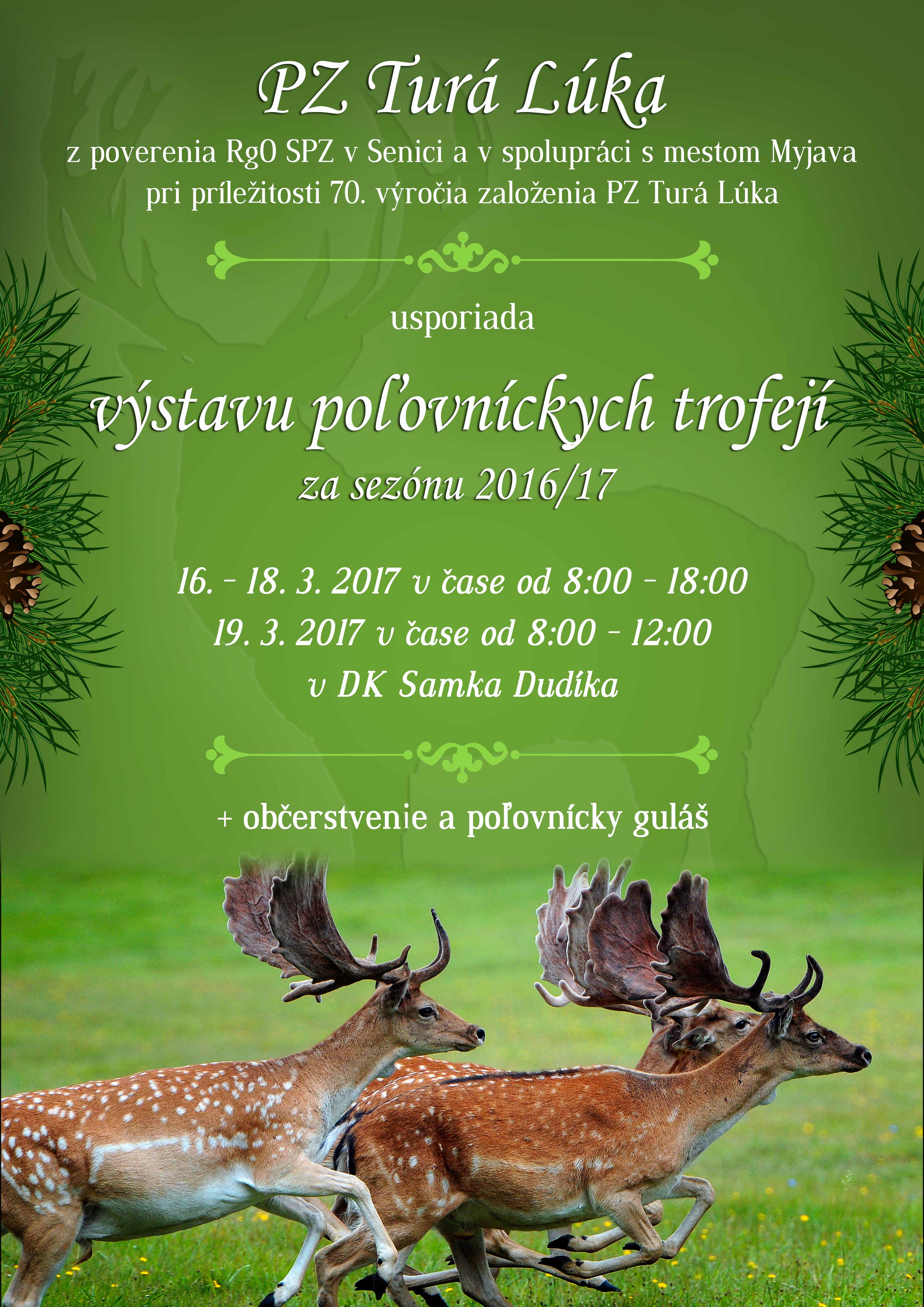 PZ Turá Lúka z poverenia RgO SPZ v Senici a v spolupráci s mestom Myjava pri príležitosti 70. výročia založenia PZ Turá Lúka, usporiada výstavu poľovníckych trofejí ulovených v sezóne 2016/2017 v Dome Kultúry Samka Dudíka, Partizánska 290/17, 907 01 Myjava, v dňoch: