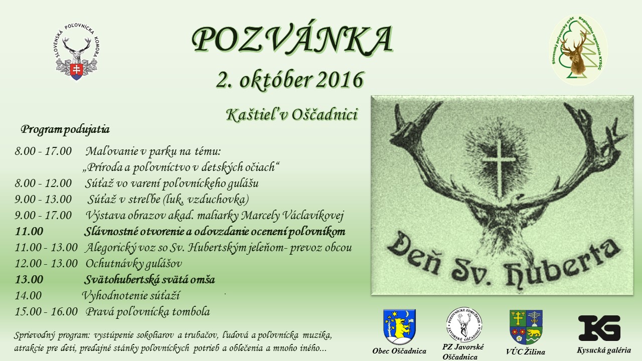 Pozývame Vás na 6. Poľovnícky deň, ktorý sa uskutoční 11. septembra 2016 na kežmarskom námestí. Ako tradične začíname svätohubertovskou sv. omšou v Bazilike sv. Kríža v Kežmarku, po jej ukončení slávnostný sprievod účastníkov na námestie, pasovanie lovca jeleňa, odovzdávanie poľovníckych vyznamenaní, sokoliari, ....
