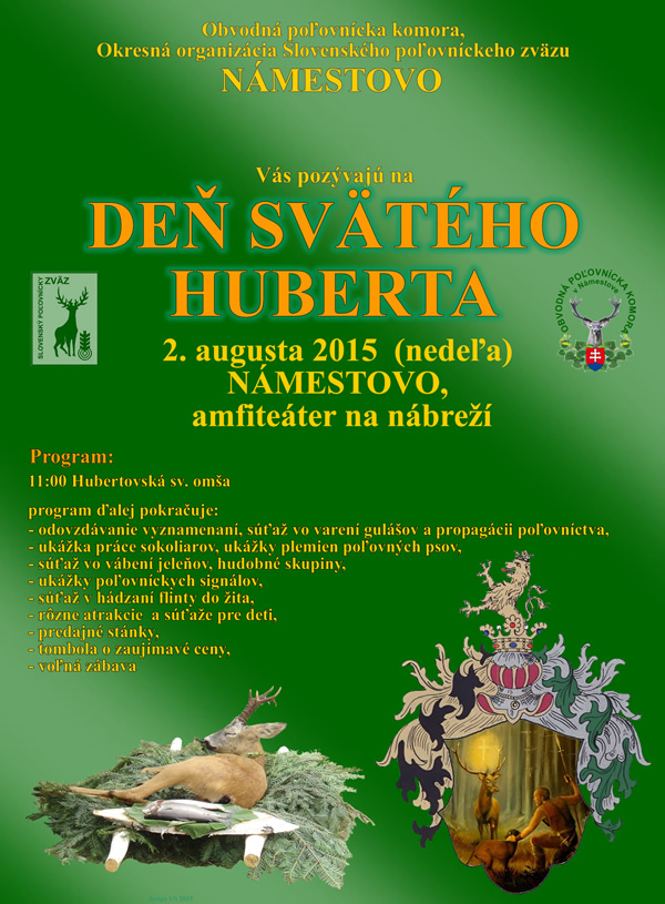 Srdečne Vás pozývame na Deň sv. Huberta v Námestove. Podujatie sa uskutoční dňa 2. augusta 2015 (nedeľa) na amfiteátri pri nábreží Oravskej priehrady.