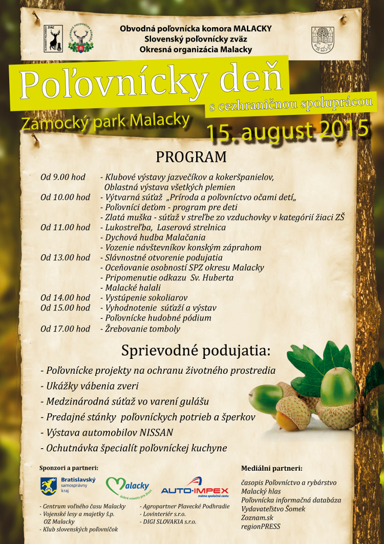 Pozývame Vás na 5.ročník Poľovníckeho dňa v Malackách. Podujatie sa uskutoční v Zámockom parku Malacky 15. augusta 2015 od 9:00 hod.