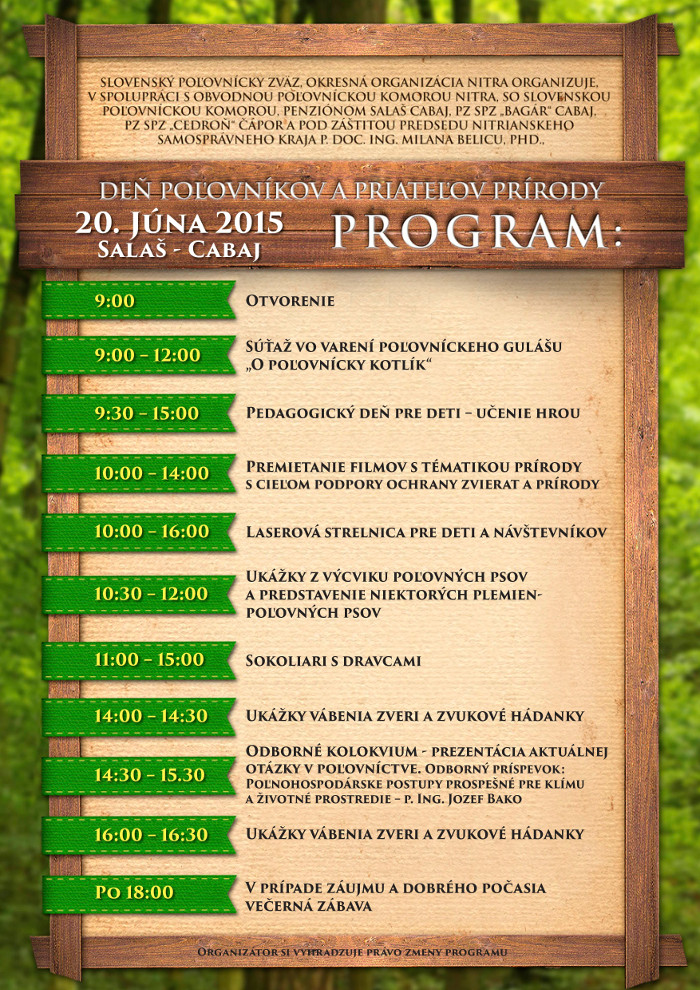 Slovenský poľovnícky zväz, okresná organizácia Nitra a Obvodná poľovnícka komora Nitra organizujú pod záštitou predsedu Nitrianskeho samosprávneho kraja p. doc. Ing. Milana Belicu, PhD. a v spolupráci so Slovenskou poľovníckou komorou, Penziónom Salaš Cabaj, PZ SPZ „Bagár“ Cabaj, PZ SPZ „Cedroň“ Čápor