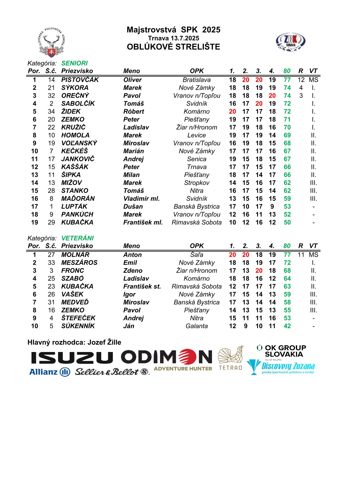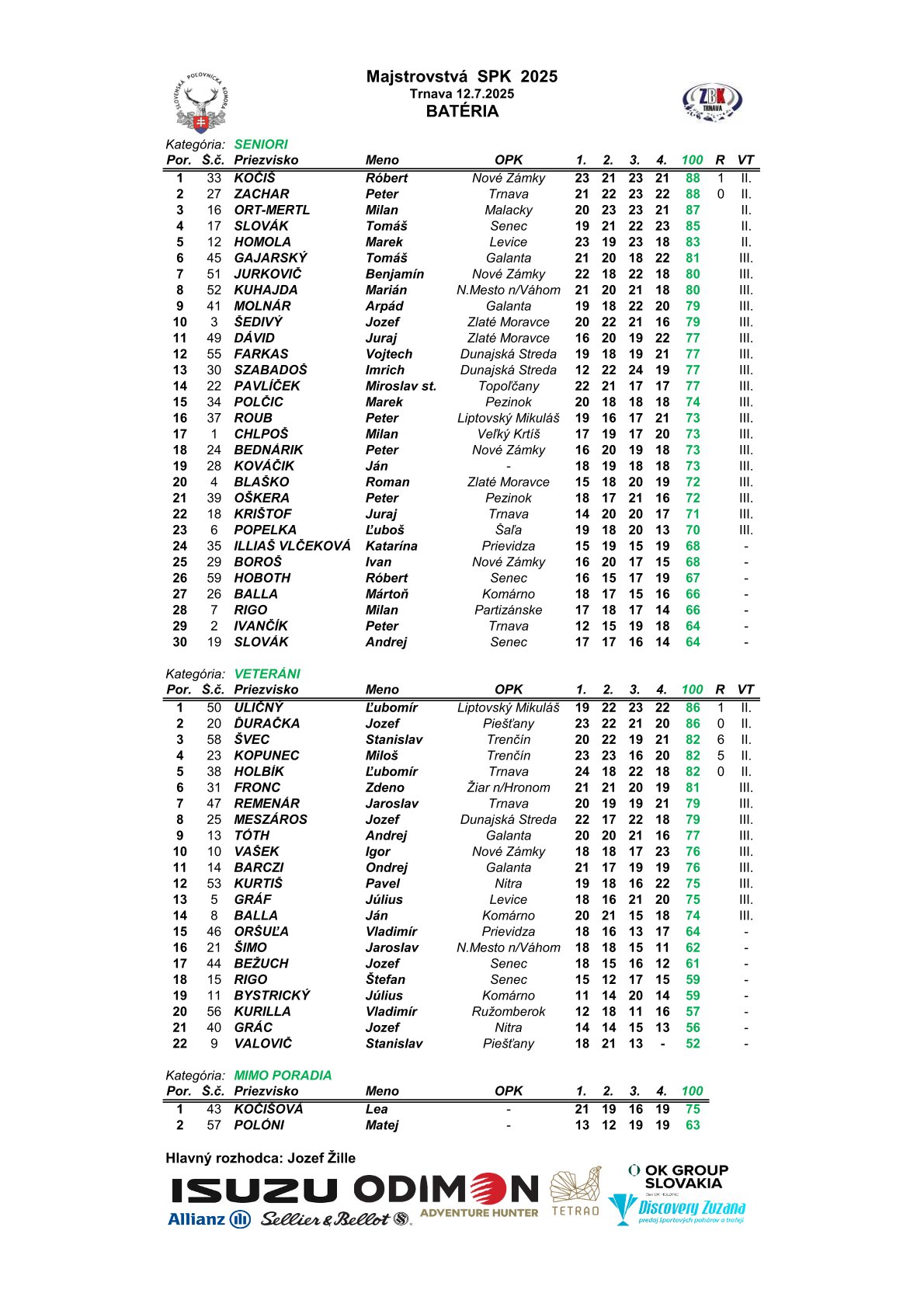 V sobotu a nedeľu sa v NSC Trnava-Štrky uskutočnili Majstrovstvá SPK v disciplíne Batéria B-100 a OS-80 a ktoré z poverenia SPK usporiadalo ZBK Trnava. Sobotných M SPK v disciplíne trap (batéria) sa zúčastnilo 54 strelcov. S nástrelom 88/100 zvíťazil a titul Majstra SPK si v rozstrele vystrieľal Róbert Košič (R1), druhý tak skončil Peter Zachar (R0) a tretie miesto obsadil Milan Ort-Mertl (87/100). U veteránov sa tiež rozstreľovalo o prvé miesto, ktoré získal Ľubomíro Uličný 87/100 (R1), druhý skončil Jozef Ďuračka (R0) a tretí Stanislav Švec (82/100), taktiež až po rozstrele až troch súťažiacich.