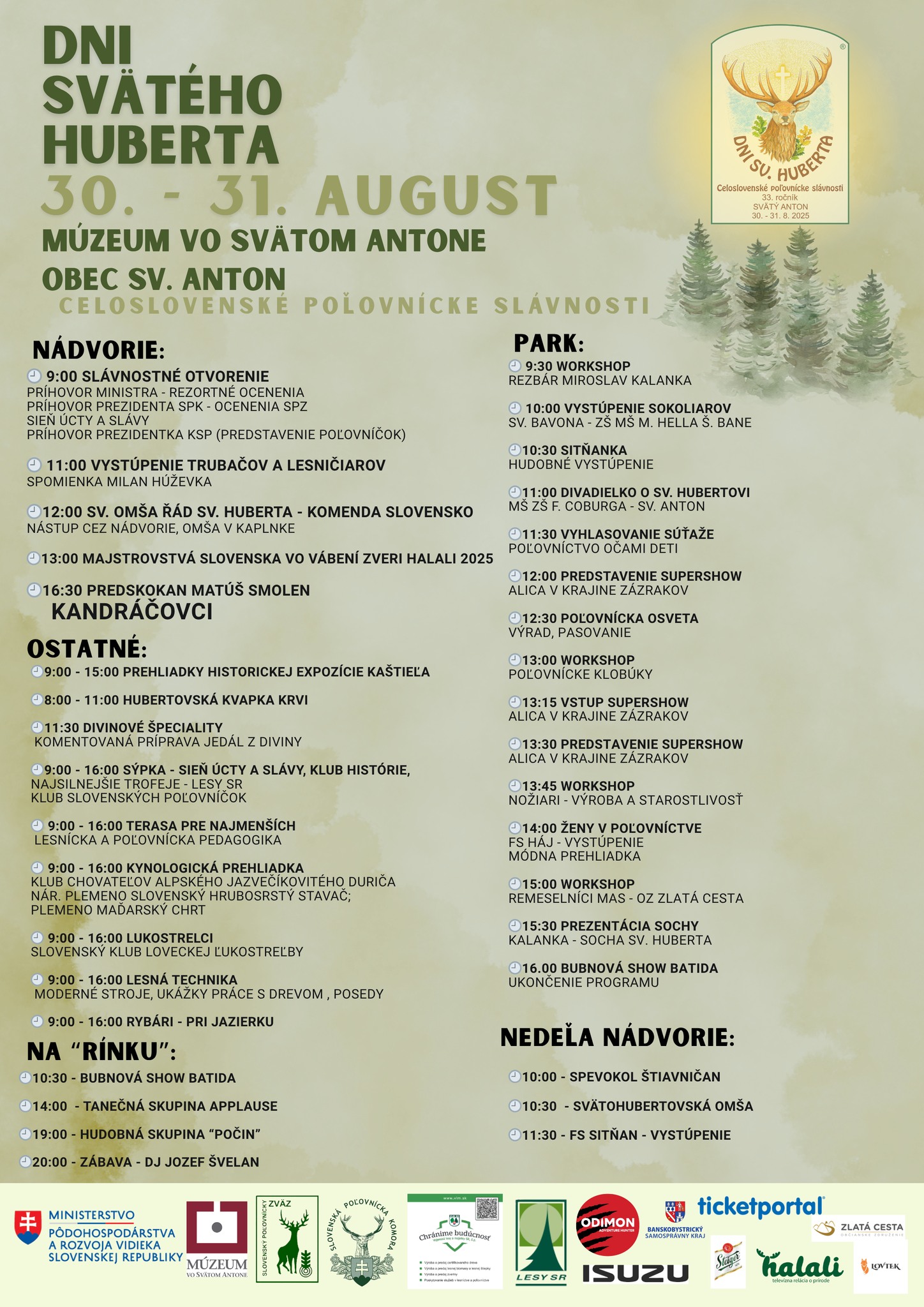 Najväčšie poľovnícke slávnosti roka sa blížia – DNI SVÄTÉHO HUBERTA 2025 sú opäť tu! Pozývame vás na ne 30. – 31. augusta už tradične v Kaštili vo Svätom Antone. 33. ročník bude výnimočný, silný, nezabudnuteľný. Tento rok sa opäť vraciame s hlavným pódiom a hlavným programom na nádvorie kaštieľa. V parku bude na pódiu prebiehať taktiež sprievodný program najmä pre deti.