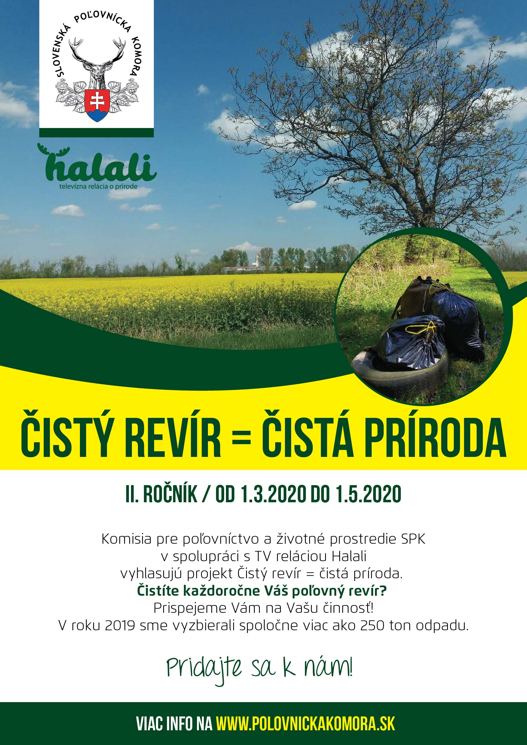 tak ako v minulom roku, aj tentokrát vyhlasuje Komisia pre poľovníctvo a životné prostredie SPK spolu s TV reláciou Halali, akciu Čistý revír = čistá príroda, ako pokračovanie úspešného I. ročníka konaného v roku 2019. Keďže projekt mal mimoriadny úspech a bol medializovaný vo všetkých médiách, tento rok sme sa rozhodli podporiť užívateľov, ktorí organizujú podobnú akciu, finančne, preplatením nákladov vo výške 50,-€ z centrálneho Fondu rozvoja a zveľaďovania poľovníctva.