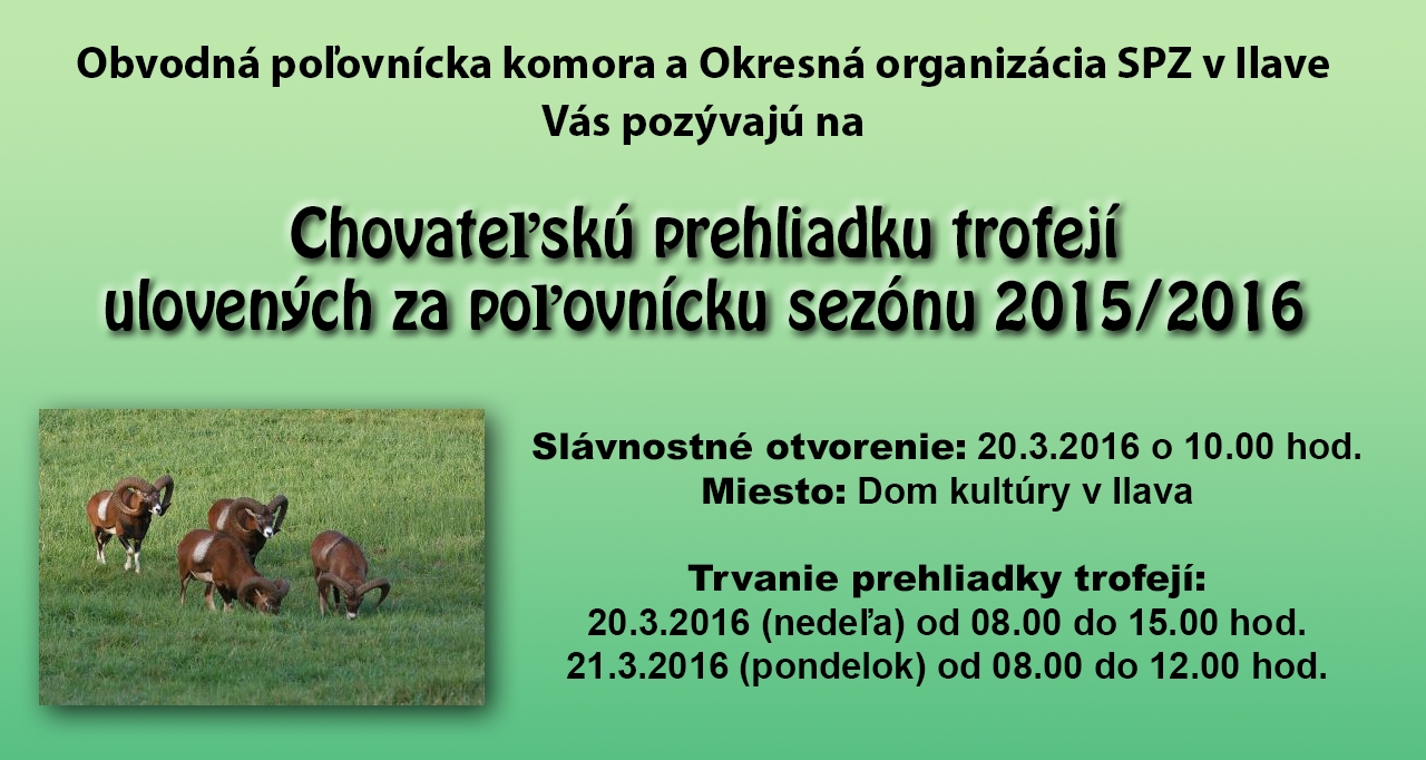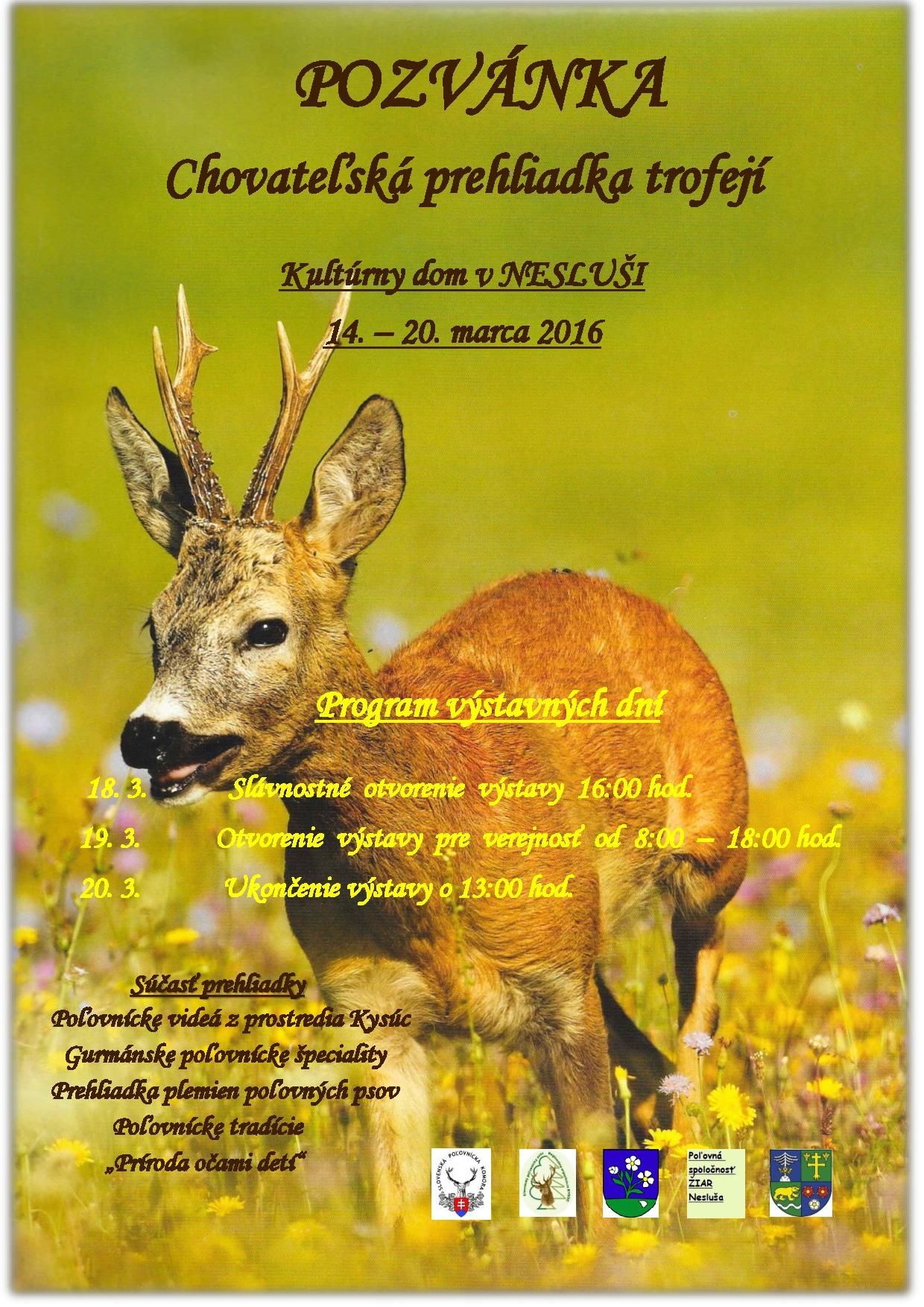 Pozývame Vás na chovateľskú prehliadku trofejí, ktorá sa uskutoční v dňoch 14.- 20. marca 2016 v Kultúrnom dome v Nesluši.