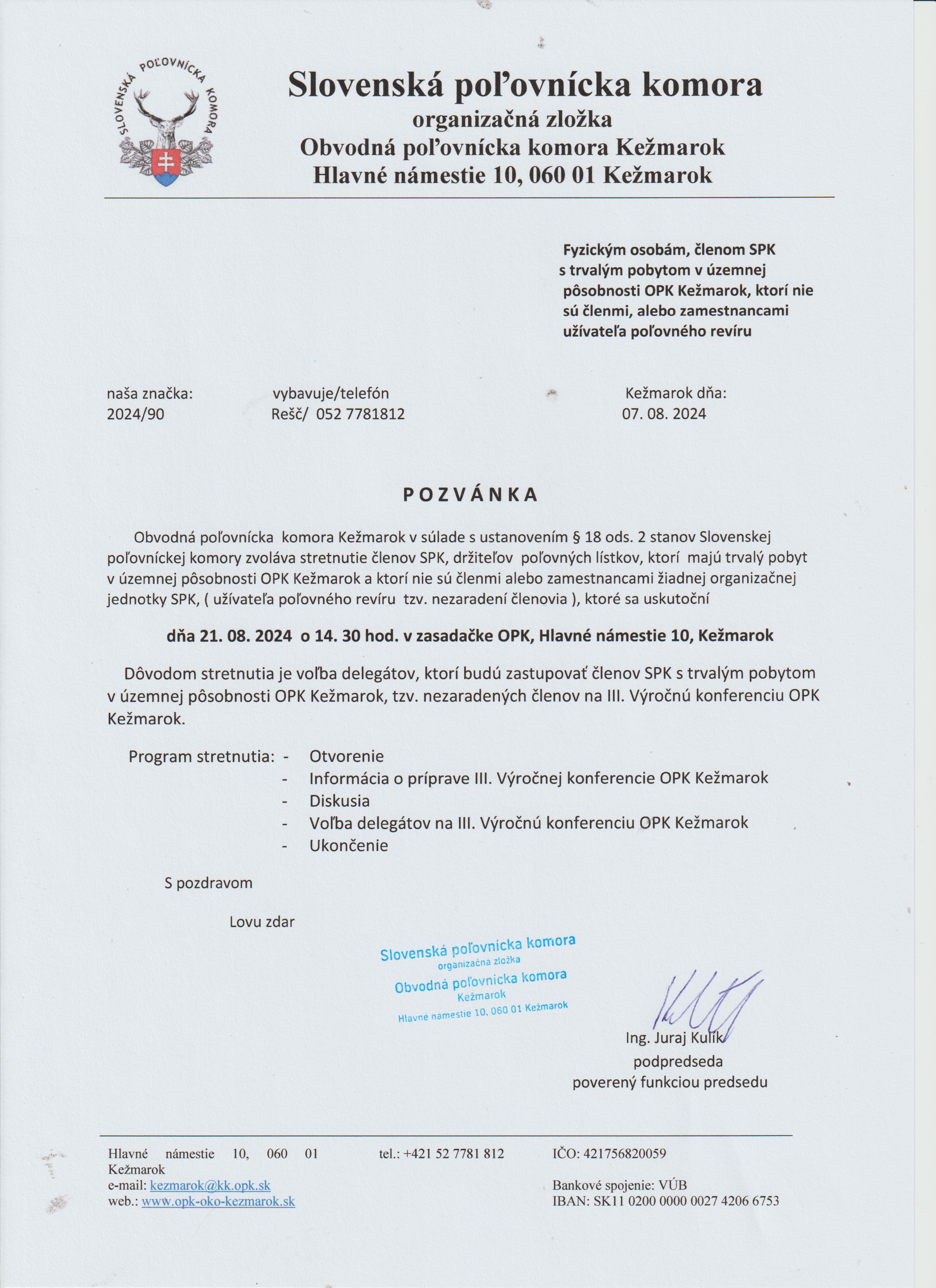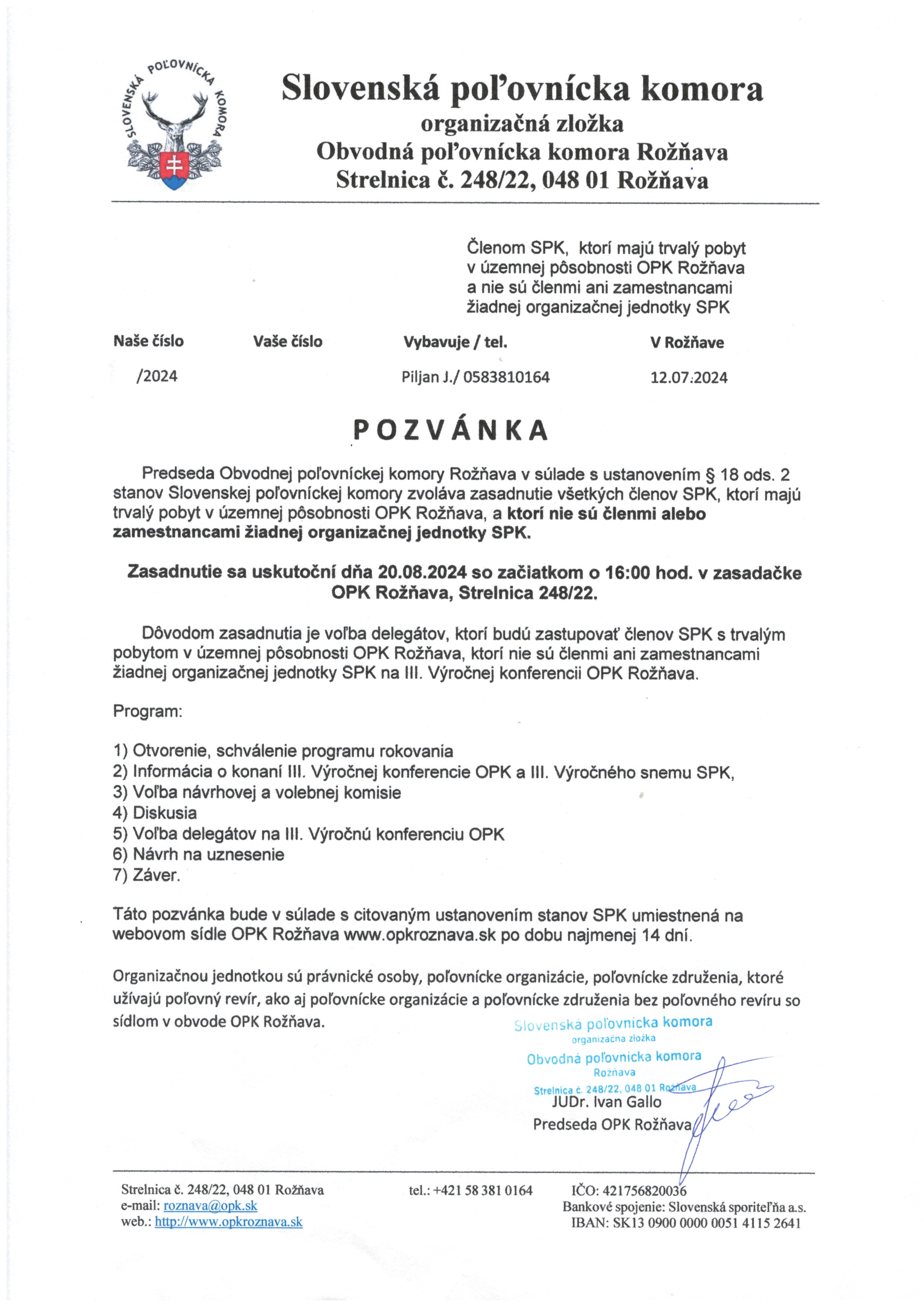 Stretnutie sa uskutoční dňa 6.9.2024 o 16,00 hod. v priestoroch reštaurácie p. Jolany Kráľovičovej, Jelenecká 86, Nitrianske Hrnčiarovce za účelom voľby delegátov na III. výročnú konferenciu OPK Nitra.