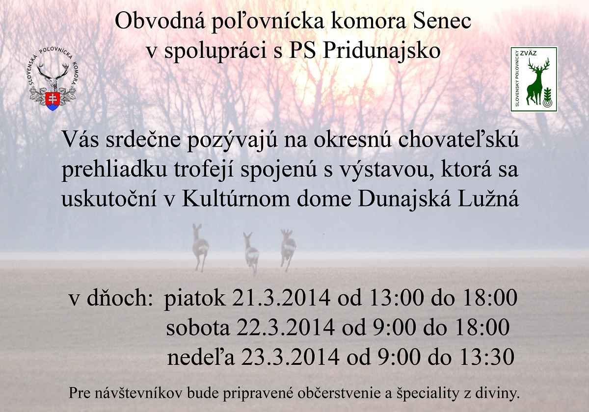Srdečne pozývame všetkých poľovníkov a priateľov poľovníctva na chovateľskú prehliadku trofejí spojenú s výstavou za OPK Senec, ktorá sa bude konať od 21. do 23. marca 2014 v Dunajskej Lužnej. Na prehliadke budú vystavené trofeje z poľovníckej sezóny 2013/2014 v obvodnej poľovníckej komore Senec. Účastníci si môžu pozrieť trofeje 104 srncov, z toho 3 medailových (1 strieborný, 2 bronzové), ďalej bronzové zbrane diviaka ako aj iné zaujímavé poľovnícke trofeje.