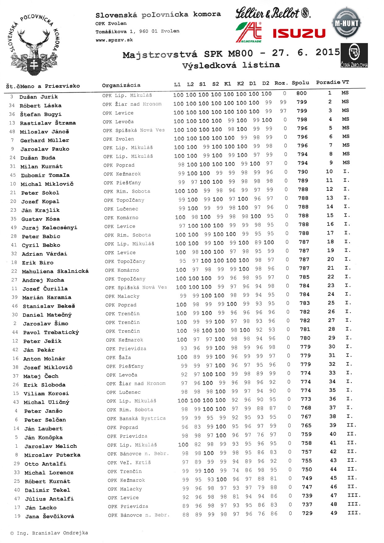Dňa 06. septembra 2015 sa podľa kalendára streleckých podujatí uskutočnil 6. ročník verejného streleckého preteku, M-800 o pohár predsedu Košického samosprávneho kraja 2015, ktorý zorganizovala Obvodná poľovnícka komora Košice.