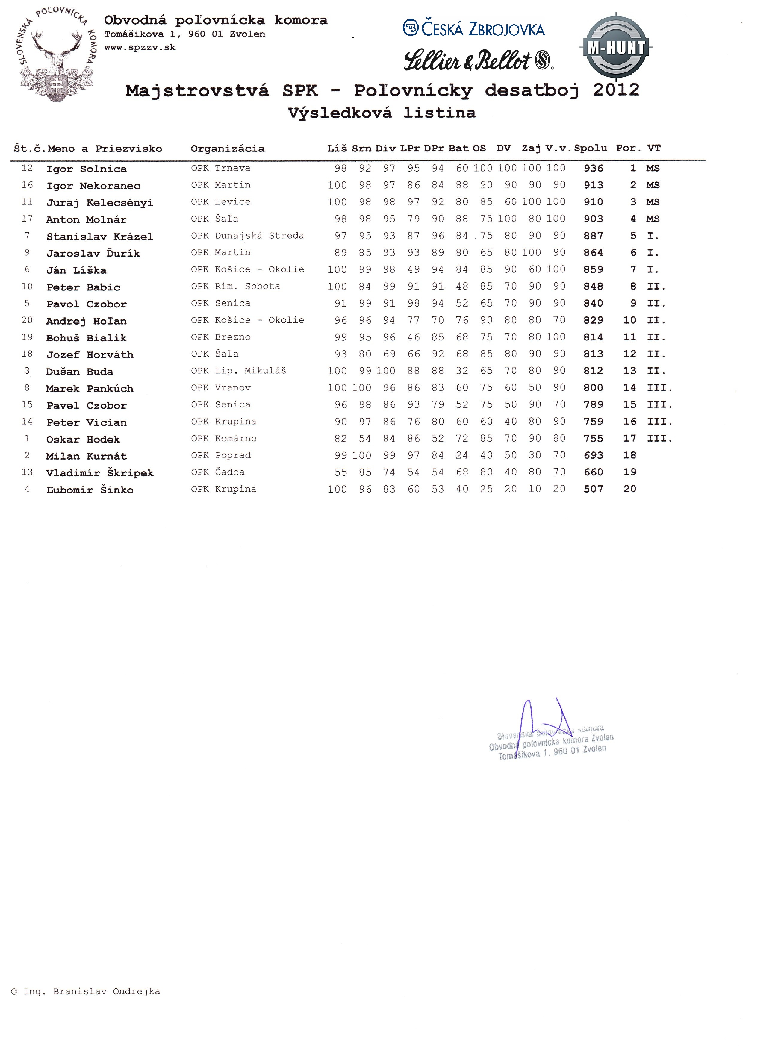 Majstrovstvá SPK v disciplíne Poľovnícky 10-boj sa konali 22 – 23. Septembra 2012 na streleckom štadióne SNP v Sielnici.